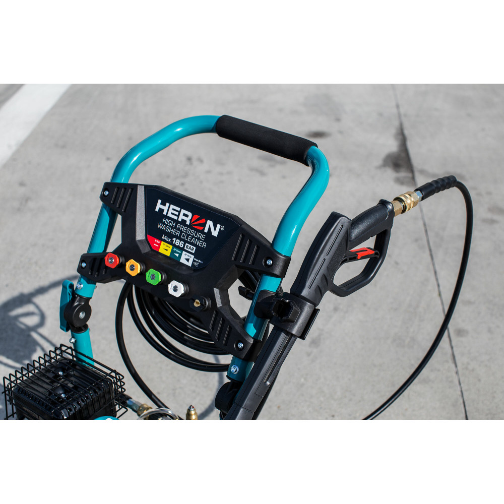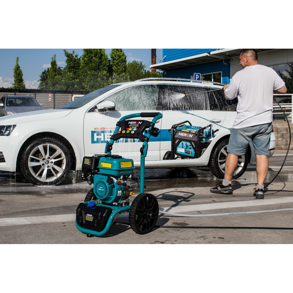 Robustný vysokotlakový čistič HERON s benzínovým motorom (196 cm³) poskytuje výkon až 186 barov, vďaka čomu si poradí aj s veľmi silne znečistenými povrchmi. Nezávislosť od elektrickej siete a masívna kovová konštrukcia s kolesami robia z tohto čističa ideálne riešenie pre čistenie strojov, áut, dlažieb, fasád, poľnohospodárskej techniky či betónových plôch.